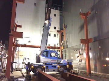 こんにちは。 駅前Sビルの工事がはじまりました。 駅前なので作業は基本的に夜おこなわれています。